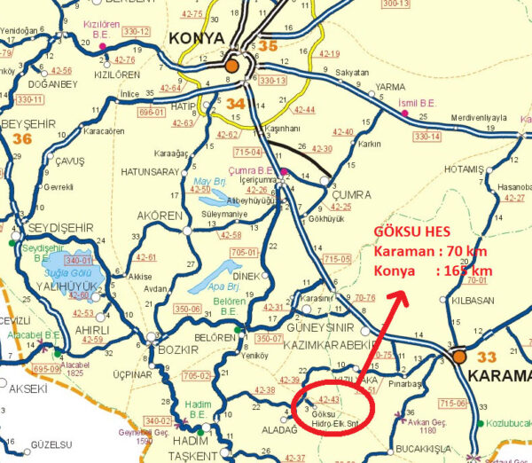 Göksu Hidroelektrik Santrali Konya İli, Güneysınır İlçesi sınırları içerisinde Göksu Nehri üzerinde Nehir Tipi olarak 80 mt.lik düşünün değerlendirilmesi amacıyla 1959 yılında işletmeye alınmıştır. Göksu Santrali 11,2 MW Kurulu gücünde olup çok yüksek bir kapasite kullanım oranı ile istikrarlı bir şekilde yıllık ortalama 60 milyon kWh enerji üretmektedir.