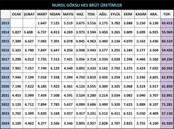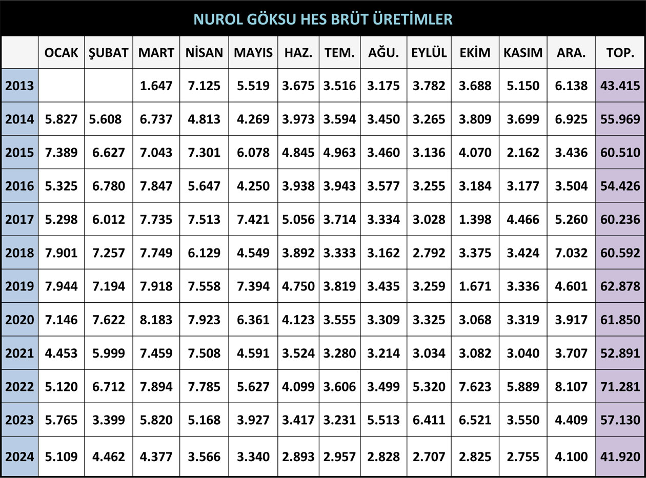 Göksu Hidrolektrik santraline ilişkin ÖİB devri sonrası üretim bilgileri aşağıda sunulmuştur.