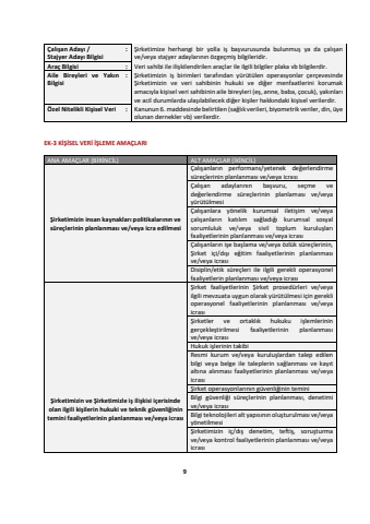 9%u00c7al%u0131%u015fan Aday%u0131 /Stajyer Aday%u0131 Bilgisi : %u015eirketimize herhangi bir yolla i%u015f ba%u015fvurusunda bulunmu%u015f ya da %u00e7al%u0131%u015fan ve/veya stajyer adaylar%u0131n%u0131n%u00f6zge%u00e7mi%u015f bilgileridir.Ara%u00e7 Bilgisi :Veri sahibi ile ili%u015fkilendirilen ara%u00e7lar ile ilgili bilgiler plakavb bilgilerdir.Aile Bireyleri ve Yak%u0131n Bilgisi:%u015eirketimizin i%u015f birimleri taraf%u0131ndan y%u00fcr%u00fct%u00fclen operasyonlar %u00e7er%u00e7evesinde %u015eirketimizin ve veri sahibinin hukuki ve di%u011fer menfaatlerini korumak amac%u0131yla ki%u015fisel veri sahibinin aile bireyleri (e%u015f, anne, baba, %u00e7ocuk), yak%u0131nlar%u0131 ve acil durumlarda ula%u015f%u0131labilecek di%u011fer ki%u015filer hakk%u0131ndaki ki%u015fisel verilerdir.%u00d6zel Nitelikli Ki%u015fisel Veri :Kanunun 6. maddesinde belirtilen (sa%u011fl%u0131k verileri, biyometrik veriler, din, %u00fcye olunan dernekler vb) verilerdir. EK-3 K%u0130%u015e%u0130SEL VER%u0130 %u0130%u015eLEME AMA%u00c7LARI ANA AMA%u00c7LAR (B%u0130R%u0130NC%u0130L)ALT AMA%u00c7LAR (%u0130K%u0130NC%u0130L)%u015eirketimizin insan kaynaklar%u0131 politikalar%u0131n%u0131n ve s%u00fcre%u00e7lerinin planlanmas%u0131 ve/veya icra edilmesi%u00c7al%u0131%u015fanlar%u0131n performans/yetenek de%u011ferlendirme s%u00fcre%u00e7lerinin planlanmas%u0131 ve/veya icras%u0131%u00c7al%u0131%u015fan adaylar%u0131n%u0131n ba%u015fvuru, se%u00e7me ve de%u011ferlendirme s%u00fcre%u00e7lerinin planlamas%u0131 ve/veya y%u00fcr%u00fct%u00fclmesi%u00c7al%u0131%u015fanlara y%u00f6nelik kurumsal ileti%u015fim ve/veya %u00e7al%u0131%u015fanlar%u0131n kat%u0131l%u0131m sa%u011flad%u0131%u011f%u0131 kurumsal sosyal sorumluluk ve/veya sivil toplum kurulu%u015flar%u0131 faaliyetlerinin planlanmas%u0131 ve/veya icras%u0131%u00c7al%u0131%u015fanlar%u0131n i%u015fe ba%u015flama ve/veya %u00f6zl%u00fck s%u00fcre%u00e7lerinin, %u015eirket i%u00e7i/d%u0131%u015f%u0131 e%u011fitim faaliyetlerinin planlanmas%u0131 ve/veya icras%u0131Disiplin/etik s%u00fcre%u00e7leri ile ilgili gerekli operasyonel faaliyetlerin planlanmas%u0131 ve/veya icras%u0131%u015eirketimizin ve %u015eirketimizle i%u015f ili%u015fkisi i%u00e7erisinde olan ilgili ki%u015filerin hukuki ve teknik g%u00fcvenli%u011finin temini faaliyetlerinin planlanmas%u0131 ve/veya icras%u0131%u015eirket faaliyetlerinin %u015eirket prosed%u00fcrleri ve/veya ilgili mevzuata uygun olarak y%u00fcr%u00fct%u00fclmesii%u00e7in gerekli operasyonel faaliyetlerinin planlanmas%u0131 ve/veya icras%u0131%u015eirketler ve ortakl%u0131k hukuku i%u015flemlerinin ger%u00e7ekle%u015ftirilmesi faaliyetlerinin planlanmas%u0131 ve/veya icras%u0131Hukuk i%u015flerinin takibiResmi kurum ve/veya kurulu%u015flardan talep edilen bilgi veya belge ile taleplerin sa%u011flanmas%u0131 ve kay%u0131t alt%u0131na al%u0131nmas%u0131 faaliyetlerinin planlanmas%u0131 ve/veya icras%u0131%u015eirket operasyonlar%u0131n%u0131n g%u00fcvenli%u011finin teminiBilgi g%u00fcvenli%u011fi s%u00fcre%u00e7lerinin planlanmas%u0131, denetimi ve/veya icras%u0131Bilgi teknolojileri alt yap%u0131s%u0131n%u0131n olu%u015fturulmas%u0131 ve/veya y%u00f6netilmesi%u015eirketimizin i%u00e7/d%u0131%u015f denetim, tefti%u015f, soru%u015fturma ve/veya kontrolfaaliyetlerinin planlanmas%u0131 ve/veya icras%u0131