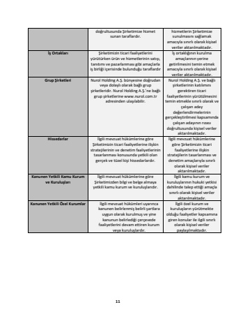 11do%u011frultusunda %u015eirketimize hizmet sunan taraflard%u0131r.hizmetlerin %u015eirketimize sunulmas%u0131n%u0131 sa%u011flamak amac%u0131yla s%u0131n%u0131rl%u0131 olarak ki%u015fisel veriler aktar%u0131lmaktad%u0131r.%u0130%u015f Ortaklar%u0131%u015eirketimizin ticari faaliyetlerini y%u00fcr%u00fct%u00fcrken %u00fcr%u00fcn ve hizmetlerinin sat%u0131%u015f%u0131, tan%u0131t%u0131m%u0131 ve pazarlanmas%u0131gibi ama%u00e7larla i%u015f birli%u011fi i%u00e7erisinde bulundu%u011fu taraflard%u0131r%u0130%u015f ortakl%u0131%u011f%u0131n%u0131n kurulma ama%u00e7lar%u0131n%u0131n yerine getirilmesini temin etmek amac%u0131yla s%u0131n%u0131rl%u0131 olarak ki%u015fisel veriler aktar%u0131lmaktad%u0131r.Grup %u015eirketleriNurol Holding A.%u015e. b%u00fcnyesine do%u011frudan veya dolayl%u0131 olarak ba%u011fl%u0131 grup %u015firketleridir. Nurol Holding A.%u015e.%u2019ne ba%u011fl%u0131 grup %u015firketlerine www.nurol.com.tradresindenula%u015f%u0131labilir.Nurol Holding A.%u015e. ve ba%u011fl%u0131 %u015firketlerinin kat%u0131l%u0131m%u0131n%u0131 gerektiren ticari faaliyetlerinin y%u00fcr%u00fct%u00fclmesini temin etmekle s%u0131n%u0131rl%u0131 olarak ve %u00e7al%u0131%u015fan aday de%u011ferlendirmelerinin ger%u00e7ekle%u015ftirilmesi kapsam%u0131nda %u00e7al%u0131%u015fan aday%u0131n%u0131n r%u0131zas%u0131 do%u011frultusunda ki%u015fisel veriler aktar%u0131lmaktad%u0131r.Hissedarlar%u0130lgili mevzuat h%u00fck%u00fcmlerine g%u00f6re %u015eirketimizin ticari faaliyetlerine ili%u015fkin stratejilerinin ve denetim faaliyetlerinin tasarlanmas%u0131 konusunda yetkili olan ger%u00e7ek ve t%u00fczel ki%u015fi hissedarlard%u0131r.%u0130lgili mevzuat h%u00fck%u00fcmlerine g%u00f6re %u015eirketimizin ticari faaliyetlerine ili%u015fkin stratejilerin tasarlanmas%u0131 ve denetim ama%u00e7lar%u0131yla s%u0131n%u0131rl%u0131 olarakki%u015fisel veriler aktar%u0131lmaktad%u0131r.Kanunen Yetkili Kamu Kurum ve Kurulu%u015flar%u0131%u0130lgili mevzuat h%u00fck%u00fcmlerine g%u00f6re %u015eirketimizden bilgi ve belge almaya yetkili kamu kurum ve kurulu%u015flar%u0131d%u0131r. %u0130lgili kamu kurum ve kurulu%u015flar%u0131n%u0131n hukuki yetkisi dahilinde talep etti%u011fi ama%u00e7la s%u0131n%u0131rl%u0131 olarak ki%u015fisel veriler aktar%u0131lmaktad%u0131r.Kanunen Yetkili %u00d6zel Kurumlar%u0130lgili mevzuat h%u00fck%u00fcmleri uyar%u0131nca kanunen belirlenmi%u015f belirli %u015fartlara uygun olarak kurulmu%u015f ve yine kanunun belirledi%u011fi %u00e7er%u00e7evede faaliyetlerini devam ettiren kurum veya kurulu%u015flard%u0131r.%u0130lgili %u00f6zel kurum ve kurulu%u015flar%u0131n y%u00fcr%u00fctmekte oldu%u011fu faaliyetler kapsam%u0131na giren konular ile ilgili s%u0131n%u0131rl%u0131 olarak ki%u015fisel veriler payla%u015f%u0131lmaktad%u0131r.