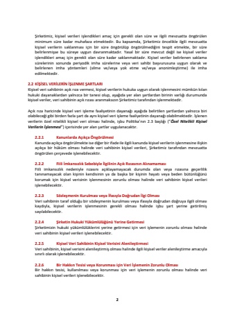 2%u015eirketimiz, ki%u015fisel verileri i%u015flendikleri ama%u00e7 i%u00e7in gerekli olan s%u00fcre ve ilgili mevzuatta %u00f6ng%u00f6r%u00fclen minimum s%u00fcre kadar muhafaza etmektedir. Bu kapsamda, %u015eirketimiz %u00f6ncelikle ilgili mevzuatta ki%u015fisel verilerin saklanmas%u0131 i%u00e7in bir s%u00fcre %u00f6ng%u00f6r%u00fcl%u00fcp %u00f6ng%u00f6r%u00fclmedi%u011fini tespit etmekte, bir s%u00fcre belirlenmi%u015fse bu s%u00fcreye uygun davranmaktad%u0131r. Yasal bir s%u00fcre mevcut de%u011fil ise ki%u015fisel veriler i%u015flendikleri ama%u00e7 i%u00e7in gerekli olan s%u00fcre kadar saklanmaktad%u0131r. Ki%u015fisel veriler belirlenen saklama s%u00fcrelerinin sonunda periyodik imha s%u00fcrelerine veya veri sahibi ba%u015fvurusuna uygun olarak ve belirlenen imha y%u00f6ntemleri (silme ve/veya yok etme ve/veya anonimle%u015ftirme) ile imha edilmektedir.2.2K%u0130%u015e%u0130SEL VER%u0130LER%u0130N %u0130%u015eLENME %u015eARTLARI Ki%u015fisel veri sahibinin a%u00e7%u0131k r%u0131za vermesi, ki%u015fisel verilerin hukuka uygun olarak i%u015flenmesini m%u00fcmk%u00fcn k%u0131lan hukuki dayanaklardan yaln%u0131zca bir tanesi olup, a%u015fa%u011f%u0131da yer alan %u015fartlardan birinin varl%u0131%u011f%u0131 durumunda ki%u015fisel veriler, veri sahibinin a%u00e7%u0131k r%u0131zas%u0131 aranmaks%u0131z%u0131n %u015eirketimiz taraf%u0131ndan i%u015flenmektedir. A%u00e7%u0131k r%u0131za haricinde ki%u015fisel veri i%u015fleme faaliyetinin dayana%u011f%u0131 a%u015fa%u011f%u0131da belirtilen %u015fartlardan yaln%u0131zca biri olabilece%u011fi gibi birden fazla %u015fart da ayn%u0131 ki%u015fisel veri i%u015fleme faaliyetinin dayana%u011f%u0131 olabilmektedir. %u0130%u015flenen verilerin %u00f6zel nitelikli ki%u015fisel veri olmas%u0131 halinde, i%u015fbu Politika%u2019n%u0131n 2.3 ba%u015fl%u0131%u011f%u0131 (%u201c%u00d6zel Nitelikli Ki%u015fisel Verilerin %u0130%u015flenmesi%u201d) i%u00e7erisinde yer alan %u015fartlar uygulanacakt%u0131r.2.2.1Kanunlarda A%u00e7%u0131k%u00e7a %u00d6ng%u00f6r%u00fclmesiKanunda a%u00e7%u0131k%u00e7a %u00f6ng%u00f6r%u00fclmekte ise di%u011fer bir ifade ile ilgili kanunda ki%u015fisel verilerin i%u015flenmesine ili%u015fkin a%u00e7%u0131k%u00e7a bir h%u00fck%u00fcm olmas%u0131 halinde veri sahibinin ki%u015fisel verileri, %u015eirketimiz taraf%u0131ndan mevzuatta %u00f6ng%u00f6r%u00fclen %u00e7er%u00e7evede i%u015flenebilecektir. 2.2.2Fiili %u0130mkans%u0131zl%u0131k Sebebiyle %u0130lgilinin A%u00e7%u0131k R%u0131zas%u0131n%u0131n Al%u0131namamas%u0131Fiili imkans%u0131zl%u0131knedeniyle r%u0131zas%u0131n%u0131 a%u00e7%u0131klayamayacak durumda olan veya r%u0131zas%u0131na ge%u00e7erlilik tan%u0131namayacak olan ki%u015finin kendisinin ya da ba%u015fka bir ki%u015finin hayat%u0131 veya beden b%u00fct%u00fcnl%u00fc%u011f%u00fcn%u00fc korumak i%u00e7in ki%u015fisel verisinin i%u015flenmesinin zorunlu olmas%u0131 halinde veri sahibinin ki%u015fisel verileri i%u015flenebilecektir. 2.2.3S%u00f6zle%u015fmenin Kurulmas%u0131 veya %u0130fas%u0131yla Do%u011frudan %u0130lgi Olmas%u0131Veri sahibinin taraf oldu%u011fu bir s%u00f6zle%u015fmenin kurulmas%u0131 veya ifas%u0131yla do%u011frudan do%u011fruya ilgili olmas%u0131 kayd%u0131yla, ki%u015fisel verilerin i%u015flenmesinin gerekli olmas%u0131 halinde i%u015fbu %u015fart yerine getirilmi%u015f say%u0131labilecektir. 2.2.4%u015eirketin Hukuki Y%u00fck%u00fcml%u00fcl%u00fc%u011f%u00fcn%u00fc Yerine Getirmesi%u015eirketimizin hukuki y%u00fck%u00fcml%u00fcl%u00fcklerini yerine getirmesi i%u00e7in veri i%u015flemenin zorunlu olmas%u0131 halinde veri sahibinin ki%u015fisel verileri i%u015flenebilecektir.2.2.5Ki%u015fisel Veri Sahibinin Ki%u015fisel Verisini Alenile%u015ftirmesiVeri sahibinin, ki%u015fisel verisini alenile%u015ftirmi%u015f olmas%u0131 halinde ilgili ki%u015fisel veriler alenile%u015ftirme amac%u0131yla s%u0131n%u0131rl%u0131 olarak i%u015flenebilecektir.2.2.6Bir Hakk%u0131n Tesisi veya Korunmas%u0131 i%u00e7in Veri %u0130%u015flemenin Zorunlu Olmas%u0131Bir hakk%u0131n tesisi, kullan%u0131lmas%u0131 veya korunmas%u0131 i%u00e7in veri i%u015flemenin zorunlu olmas%u0131 halinde veri sahibinin ki%u015fisel verileri i%u015flenebilecektir.