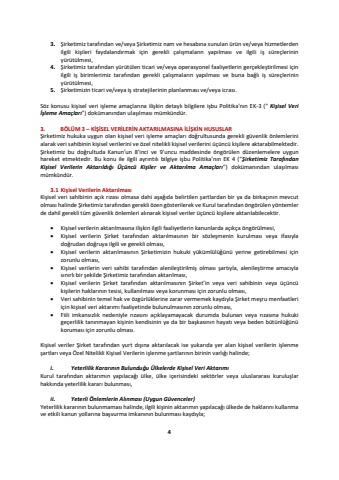 43.%u015eirketimiz taraf%u0131ndan ve/veya %u015eirketimiz nam ve hesab%u0131na sunulan %u00fcr%u00fcn ve/veya hizmetlerden ilgili ki%u015fileri faydaland%u0131rmak i%u00e7in gerekli %u00e7al%u0131%u015fmalar%u0131n yap%u0131lmas%u0131 ve ilgili i%u015f s%u00fcre%u00e7lerinin y%u00fcr%u00fct%u00fclmesi,4.%u015eirketimiz taraf%u0131ndan y%u00fcr%u00fct%u00fclen ticari ve/veya operasyonel faaliyetlerin ger%u00e7ekle%u015ftirilmesi i%u00e7in ilgili i%u015f birimlerimiz taraf%u0131ndan gerekli %u00e7al%u0131%u015fmalar%u0131n yap%u0131lmas%u0131 ve buna ba%u011fl%u0131 i%u015f s%u00fcre%u00e7lerinin y%u00fcr%u00fct%u00fclmesi,5.%u015eirketimizin ticari ve/veya i%u015f stratejilerinin planlanmas%u0131 ve/veya icras%u0131.S%u00f6z konusu ki%u015fisel veri i%u015fleme ama%u00e7lar%u0131na ili%u015fkin detayl%u0131 bilgilere i%u015fbu Politika%u2019n%u0131n EK-3 (%u201cKi%u015fisel Veri %u0130%u015fleme Ama%u00e7lar%u0131%u201d) dok%u00fcman%u0131ndan ula%u015f%u0131lmas%u0131 m%u00fcmk%u00fcnd%u00fcr.3.B%u00d6L%u00dcM 3 %u2013K%u0130%u015e%u0130SEL VER%u0130LER%u0130N AKTARILMASINA %u0130L%u0130%u015eK%u0130N HUSUSLAR %u015eirketimiz hukuka uygun olan ki%u015fisel veri i%u015fleme ama%u00e7lar%u0131 do%u011frultusunda gerekli g%u00fcvenlik %u00f6nlemlerini alarak veri sahibinin ki%u015fisel verilerini ve %u00f6zel nitelikli ki%u015fisel verilerini %u00fc%u00e7%u00fcnc%u00fc ki%u015filere aktarabilmektedir. %u015eirketimiz bu do%u011frultuda Kanun%u2019un 8%u2019inci ve 9%u2019uncu maddesinde %u00f6ng%u00f6r%u00fclen d%u00fczenlemelere uygun hareket etmektedir. Bu konu ile ilgili ayr%u0131nt%u0131l%u0131 bilgiye i%u015fbu Politika%u2019n%u0131n EK 4 (%u201c%u015eirketimiz Taraf%u0131ndan Ki%u015fisel Verilerin Aktar%u0131ld%u0131%u011f%u0131 %u00dc%u00e7%u00fcnc%u00fc Ki%u015filer ve Aktar%u0131lma Ama%u00e7lar%u0131%u201d) dok%u00fcman%u0131ndan ula%u015f%u0131lmas%u0131 m%u00fcmk%u00fcnd%u00fcr.3.1Ki%u015fisel Verilerin Aktar%u0131lmas%u0131 Ki%u015fisel veri sahibinin a%u00e7%u0131k r%u0131zas%u0131 olmasa dahi a%u015fa%u011f%u0131da belirtilen %u015fartlardan bir ya da birka%u00e7%u0131n%u0131n mevcut olmas%u0131 halinde %u015eirketimiz taraf%u0131ndan gerekli %u00f6zen g%u00f6sterilerek ve Kurul taraf%u0131ndan %u00f6ng%u00f6r%u00fclen y%u00f6ntemler de dahil gerekli t%u00fcm g%u00fcvenlik %u00f6nlemleri al%u0131narakki%u015fisel veriler %u00fc%u00e7%u00fcnc%u00fc ki%u015filere aktar%u0131labilecektir. %u2022Ki%u015fisel verilerin aktar%u0131lmas%u0131na ili%u015fkin ilgili faaliyetlerin kanunlarda a%u00e7%u0131k%u00e7a %u00f6ng%u00f6r%u00fclmesi, %u2022Ki%u015fisel verilerin %u015eirket taraf%u0131ndan aktar%u0131lmas%u0131n%u0131n bir s%u00f6zle%u015fmenin kurulmas%u0131 veya ifas%u0131yla do%u011frudan do%u011fruya ilgili ve gerekli olmas%u0131,%u2022Ki%u015fisel verilerin aktar%u0131lmas%u0131n%u0131n %u015eirketimizin hukuki y%u00fck%u00fcml%u00fcl%u00fc%u011f%u00fcn%u00fc yerine getirebilmesi i%u00e7in zorunlu olmas%u0131, %u2022Ki%u015fisel verilerin veri sahibi taraf%u0131ndan alenile%u015ftirilmi%u015f olmas%u0131 %u015fart%u0131yla, alenile%u015ftirme amac%u0131yla s%u0131n%u0131rl%u0131 bir %u015fekilde %u015eirketimiz taraf%u0131ndan aktar%u0131lmas%u0131, %u2022Ki%u015fisel verilerin %u015eirket taraf%u0131ndan aktar%u0131lmas%u0131n%u0131n %u015eirket%u2019in veya veri sahibinin veya %u00fc%u00e7%u00fcnc%u00fc ki%u015filerin haklar%u0131n%u0131n tesisi, kullan%u0131lmas%u0131 veya korunmas%u0131 i%u00e7in zorunlu olmas%u0131, %u2022Veri sahibinin temel hak ve %u00f6zg%u00fcrl%u00fcklerine zarar vermemek kayd%u0131yla %u015eirket me%u015fru menfaatleri i%u00e7in ki%u015fisel veri aktar%u0131m%u0131 faaliyetinde bulunulmas%u0131n%u0131n zorunlu olmas%u0131, %u2022Fiili imkans%u0131zl%u0131knedeniyle r%u0131zas%u0131n%u0131 a%u00e7%u0131klayamayacak durumda bulunan veya r%u0131zas%u0131na hukuki ge%u00e7erlilik tan%u0131nmayan ki%u015finin kendisinin ya da bir ba%u015fkas%u0131n%u0131n hayat%u0131 veya beden b%u00fct%u00fcnl%u00fc%u011f%u00fcn%u00fc korumas%u0131 i%u00e7in zorunlu olmas%u0131. Ki%u015fisel veriler %u015eirket taraf%u0131ndan yurt d%u0131%u015f%u0131na aktar%u0131lacak ise yukar%u0131da yer alan ki%u015fisel verilerin i%u015flenme %u015fartlar%u0131 veya%u00d6zel Nitelikli Ki%u015fisel Verilerin i%u015flenme %u015fartlar%u0131n%u0131n birinin varl%u0131%u011f%u0131 halinde; i.Yeterlilik Karar%u0131n%u0131n Bulundu%u011fu %u00dclkelerde Ki%u015fisel Veri Aktar%u0131m%u0131 Kurul taraf%u0131ndan aktar%u0131m%u0131n yap%u0131laca%u011f%u0131 %u00fclke, %u00fclke i%u00e7erisindeki sekt%u00f6rler veya uluslararas%u0131 kurulu%u015flar hakk%u0131nda yeterlilik karar%u0131 bulunmas%u0131, ii.Yeterli %u00d6nlemlerin Al%u0131nmas%u0131 (Uygun G%u00fcvenceler) Yeterlilik karar%u0131n%u0131n bulunmamas%u0131 halinde, ilgili ki%u015finin aktar%u0131m%u0131n yap%u0131laca%u011f%u0131 %u00fclkede de haklar%u0131n%u0131 kullanma ve etkili kanun yollar%u0131na ba%u015fvurma imkan%u0131n%u0131n bulunmas%u0131 kayd%u0131yla;