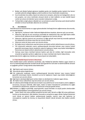 5%u2022Birden %u00e7ok %u00fclkede faaliyet g%u00f6steren te%u015febb%u00fcs grubu i%u00e7in te%u015febb%u00fcs grubu %u00fcyelerin her birinin uymakla y%u00fck%u00fcml%u00fc oldu%u011fu ba%u011flay%u0131c%u0131 %u015firket kurallar%u0131n%u0131n Kurul taraf%u0131ndan onaylanmas%u0131, %u2022Kurul taraf%u0131ndan ilan edilen, ki%u015fisel veri aktar%u0131m%u0131n%u0131n ama%u00e7lar%u0131, aktar%u0131lan veri kategorileri, al%u0131c%u0131 ve al%u0131c%u0131 gruplar%u0131, veri al%u0131c%u0131s%u0131 taraf%u0131ndan al%u0131nacak teknik ve idari tedbirler ve %u00f6zel nitelikli ki%u015fisel veriler i%u00e7in al%u0131nan ek %u00f6nlemleri i%u00e7eren standart s%u00f6zle%u015fmenin varl%u0131%u011f%u0131, %u2022T%u00fcrkiye%u2019deki ve ilgili yabanc%u0131 %u00fclkedeki veri sorumlular%u0131n%u0131n yeterli korumay%u0131 yaz%u0131l%u0131 olarak taahh%u00fct etmeleri ve Kurul taraf%u0131ndan aktar%u0131ma izin verilmesi.iii.Ar%u0131zi Aktar%u0131m Yeterlilik karar%u0131n%u0131n bulunmamas%u0131 ve uygun g%u00fcvencelerden herhangi birinin sa%u011flanmamas%u0131 durumunda, ar%u0131zi olmak kayd%u0131yla;%u2022%u0130lgili ki%u015finin, muhtemel riskler hakk%u0131nda bilgilendirilmesi kayd%u0131yla, aktar%u0131ma a%u00e7%u0131k r%u0131za vermesi, %u2022Aktar%u0131m%u0131n, ilgili ki%u015fi ile veri sorumlusu aras%u0131ndaki bir s%u00f6zle%u015fmenin ifas%u0131 veya ilgili ki%u015finin talebi %u00fczerine al%u0131nan s%u00f6zle%u015fme %u00f6ncesi tedbirlerin uygulamas%u0131 i%u00e7in zorunlu olmas%u0131,%u2022Aktar%u0131m%u0131n, ilgili ki%u015fi yarar%u0131na veri sorumlusu ve di%u011fer ger%u00e7ek veya t%u00fczel ki%u015fi aras%u0131nda yap%u0131lacak bir s%u00f6zle%u015fmenin kurulmas%u0131 veya ifas%u0131 i%u00e7in zorunlu olmas%u0131, %u2022Aktar%u0131m%u0131n %u00fcst%u00fcn bir kamu yarar%u0131 i%u00e7in zorunlu olmas%u0131, %u2022Bir hakk%u0131n tesisi, kullan%u0131lmas%u0131 veya korunmas%u0131 i%u00e7in ki%u015fisel verilerin aktar%u0131lmas%u0131n%u0131n zorunlu olmas%u0131,%u2022Fiili imkans%u0131zl%u0131knedeniyle r%u0131zas%u0131n%u0131 a%u00e7%u0131klayamayacak durumda bulunan veya r%u0131zas%u0131na hukuki ge%u00e7erlilik tan%u0131nmayan ki%u015finin kendisinin yada bir ba%u015fkas%u0131n%u0131n hayat%u0131 veya beden b%u00fct%u00fcnl%u00fc%u011f%u00fcn%u00fcn korunmas%u0131 i%u00e7in ki%u015fisel verilerin aktar%u0131lmas%u0131n%u0131n zorunlu olmas%u0131, %u2022Kamuya veya me%u015fru menfaati bulunan ki%u015filere a%u00e7%u0131k olan bir sicilden, ilgili mevzuatta sicile eri%u015fmek i%u00e7in gereken %u015fartlar%u0131n sa%u011flanmas%u0131 ve me%u015fru menfaati olan ki%u015finin talep etmesi, %u015eartlar%u0131ndan birinin sa%u011flanmas%u0131 halinde yurt d%u0131%u015f%u0131na ki%u015fisel veri aktar%u0131labilir.3.2%u00d6zel Nitelikli Ki%u015fisel Verilerin Aktar%u0131lmas%u0131 %u00d6zel nitelikli ki%u015fisel veriler %u015eirketimiz taraf%u0131ndan, i%u015fbu Politika%u2019da belirtilen ilkelere uygun olarak ve Kurul%u2019un belirleyece%u011fi y%u00f6ntemler de dahil olmak %u00fczere gerekli her t%u00fcrl%u00fc idari ve teknik tedbirler al%u0131narak ve a%u015fa%u011f%u0131daki %u015fartlar%u0131n varl%u0131%u011f%u0131 halinde aktar%u0131labilecektir:(i)%u0130lgili ki%u015finin a%u00e7%u0131k r%u0131zas%u0131n%u0131n olmas%u0131,(ii)Kanunlarda a%u00e7%u0131k%u00e7a %u00f6ng%u00f6r%u00fclmesi,(iii)Fiili imk%u00e2ns%u0131zl%u0131k nedeniyle r%u0131zas%u0131n%u0131 a%u00e7%u0131klayamayacak durumda bulunan veya r%u0131zas%u0131na hukuki ge%u00e7erlilik tan%u0131nmayan ki%u015finin, kendisinin ya da bir ba%u015fkas%u0131n%u0131n hayat%u0131 veya beden b%u00fct%u00fcnl%u00fc%u011f%u00fcn%u00fcn korunmas%u0131 i%u00e7in zorunlu olmas%u0131,(iv)%u0130lgili ki%u015finin alenile%u015ftirdi%u011fi ki%u015fisel verilere ili%u015fkin ve alenile%u015ftirme iradesine uygun olmas%u0131,(v)Bir hakk%u0131n tesisi, kullan%u0131lmas%u0131 veya korunmas%u0131 i%u00e7in zorunlu olmas%u0131,(vi)S%u0131r saklama y%u00fck%u00fcml%u00fcl%u00fc%u011f%u00fc alt%u0131nda bulunan ki%u015filer veya yetkili kurum ve kurulu%u015flarca, kamu sa%u011fl%u0131%u011f%u0131n%u0131n korunmas%u0131, koruyucu hekimlik, t%u0131bbi te%u015fhis, tedavi ve bak%u0131m hizmetlerinin y%u00fcr%u00fct%u00fclmesi ile sa%u011fl%u0131k hizmetlerinin planlanmas%u0131, y%u00f6netimi ve finansman%u0131 amac%u0131ylagerekli olmas%u0131,(vii)%u0130stihdam, i%u015f sa%u011fl%u0131%u011f%u0131 ve g%u00fcvenli%u011fi, sosyal g%u00fcvenlik, sosyal hizmetler ve sosyal yard%u0131m alanlar%u0131ndaki hukuki y%u00fck%u00fcml%u00fcl%u00fcklerin yerine getirilmesi i%u00e7in zorunlu olmas%u0131,(viii)Siyasi, felsefi, dini veya sendikal ama%u00e7larla kurulan vak%u0131f, dernek ve di%u011fer k%u00e2r amac%u0131 g%u00fctmeyen kurulu%u015f ya da olu%u015fumlar%u0131n, t%u00e2bi olduklar%u0131 mevzuata ve ama%u00e7lar%u0131na uygun olmak, faaliyet alanlar%u0131yla s%u0131n%u0131rl%u0131 olmak ve %u00fc%u00e7%u00fcnc%u00fc ki%u015filere a%u00e7%u0131klanmamak kayd%u0131yla; mevcut veya eski %u00fcyelerine ve mensuplar%u0131na veyahut bu kurulu%u015f ve olu%u015fumlarla d%u00fczenli olarak temasta olan ki%u015filere y%u00f6nelik olmas%u0131.
