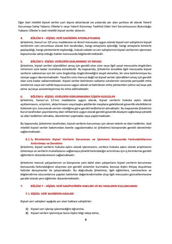 6E%u011fer %u00f6zel nitelikli ki%u015fisel veriler yurt d%u0131%u015f%u0131na aktar%u0131lacak ise yukar%u0131da yer alan %u015fartlara ek olarak Yeterli Korumaya Sahip Yabanc%u0131 %u00dclkeler%u2019e veya Yeterli Korumay%u0131 Taahh%u00fct Eden Veri Sorumlusunun Bulundu%u011fu Yabanc%u0131 %u00dclkeler%u2019e %u00f6zel nitelikli ki%u015fisel veriler aktar%u0131l%u0131r.4.B%u00d6L%u00dcM 4 %u2013K%u0130%u015e%u0130SEL VER%u0130 SAH%u0130B%u0130N%u0130N AYDINLATILMASI %u015eirketimiz, Kanun%u2019un 10%u2019uncumaddesine ve ikincil mevzuata uygun olarak ki%u015fisel veri sahiplerini ki%u015fisel verilerinin veri sorumlusu olarak kim taraf%u0131ndan, hangi ama%u00e7larla i%u015flendi%u011fi, hangi ama%u00e7larla kimlerle payla%u015f%u0131ld%u0131%u011f%u0131, hangi y%u00f6ntemlerle topland%u0131%u011f%u0131,hukuki sebebi ve veri sahiplerinin ki%u015fisel verilerinin i%u015flenmesi kapsam%u0131nda sahip oldu%u011fu haklar%u0131 konusunda bilgilendirmektedir.5.B%u00d6L%u00dcM 5-K%u0130%u015e%u0130SEL VER%u0130LER%u0130N SAKLANMASI VE %u0130MHASI %u015eirketimiz, ki%u015fisel verileri i%u015flendikleri ama%u00e7 i%u00e7in gerekli olan s%u00fcre veyailgili yasal mevzuatta %u00f6ng%u00f6r%u00fclen minimum s%u00fcre kadar muhafaza etmektedir. Bu kapsamda, %u015eirketimiz %u00f6ncelikle ilgili mevzuatta ki%u015fisel verilerin saklanmas%u0131 i%u00e7in bir s%u00fcre %u00f6ng%u00f6r%u00fcl%u00fcp %u00f6ng%u00f6r%u00fclmedi%u011fini tespit etmekte, bir s%u00fcre belirlenmi%u015fse bu s%u00fcreye uygun davranmaktad%u0131r. Yasal bir s%u00fcre mevcut de%u011fil ise ki%u015fisel veriler i%u015flendikleri ama%u00e7 i%u00e7in gerekli olan s%u00fcre kadar saklanmaktad%u0131r. Ki%u015fisel veriler belirlenen saklama s%u00fcrelerinin sonunda periyodik imha s%u00fcrelerine veya veri sahibi ba%u015fvurusuna uygun olarak ve belirlenen imha y%u00f6ntemleri (silme ve/veya yok etme ve/veya anonimle%u015ftirme) ile imha edilmektedir. 6.B%u00d6L%u00dcM 6-K%u0130%u015e%u0130SEL VER%u0130LER%u0130N KORUNMASINA %u0130L%u0130%u015eK%u0130N HUSUSLAR %u015eirketimiz, Kanun%u2019un 12%u2019inci maddesine uygun olarak, ki%u015fisel verilerin hukuka ayk%u0131r%u0131 olarak a%u00e7%u0131klanmas%u0131n%u0131, eri%u015fimini, aktar%u0131lmas%u0131n%u0131 veya ba%u015fka %u015fekillerde meydana gelebilecek g%u00fcvenlik eksikliklerini %u00f6nlemek i%u00e7in, korunacak verinin niteli%u011fine g%u00f6re gerekli tedbirlerini almaktad%u0131r. Bu kapsamda %u015eirketimiz Kurul taraf%u0131ndan yay%u0131mlanm%u0131%u015f olan rehberlere uygun olarak gerekli g%u00fcvenlik d%u00fczeyini sa%u011flamaya y%u00f6nelik ve idari tedbirleri almakta, denetimleri yapmakta veya yapt%u0131rmaktad%u0131r.Bu kapsamda, %u015eirketimiz taraf%u0131ndan, ki%u015fisel verilerin korunmas%u0131 i%u00e7in al%u0131nan teknik ve idari tedbirler, %u00f6zel nitelikli ki%u015fisel veriler bak%u0131m%u0131ndan %u00f6zenle uygulanmakta ve %u015eirketimiz b%u00fcnyesinde gerekli denetimler sa%u011flanmaktad%u0131r.6.1%u0130%u015f Birimlerinin Ki%u015fisel Verilerin Korunmas%u0131 ve %u0130%u015flenmesi Konusunda Fark%u0131ndal%u0131klar%u0131n%u0131nArtt%u0131r%u0131lmas%u0131 ve Denetimi %u015eirketimiz, ki%u015fisel verilerin hukuka ayk%u0131r%u0131 olarak i%u015flenmesini, verilere hukuka ayk%u0131r%u0131 olarak eri%u015filmesini %u00f6nlemeye ve verilerin muhafazas%u0131n%u0131 sa%u011flamaya y%u00f6nelik fark%u0131ndal%u0131%u011f%u0131n art%u0131r%u0131lmas%u0131 i%u00e7in i%u015f birimlerine gerekli e%u011fitimlerin d%u00fczenlenmesini sa%u011flamaktad%u0131r.%u015eirketimiz mevcut %u00e7al%u0131%u015fanlar%u0131n%u0131n ve b%u00fcnyesine yeni dahil olan %u00e7al%u0131%u015fanlar%u0131n ki%u015fisel verilerin korunmas%u0131 konusunda fark%u0131ndal%u0131%u011f%u0131n%u0131n olu%u015fmas%u0131 i%u00e7in gerekli sistemler kurmakta, konuya ili%u015fkin ihtiya%u00e7 duyulmas%u0131 halinde dan%u0131%u015fmanlar ile %u00e7al%u0131%u015fmaktad%u0131r. Bu do%u011frultuda%u015eirketimiz, ilgili e%u011fitimlere, seminerlere ve bilgilendirme oturumlar%u0131na yap%u0131lan kat%u0131l%u0131mlar de%u011ferlendirmekte olup ilgili mevzuat%u0131n g%u00fcncellenmesine paralel olarak yeni e%u011fitimler d%u00fczenlemektedir.7.B%u00d6L%u00dcM 7 %u2013K%u0130%u015e%u0130SEL VER%u0130 SAH%u0130PLER%u0130N%u0130N HAKLARI VE BU HAKLARIN KULLANILMASI 7.1K%u0130%u015e%u0130SEL VER%u0130 SAH%u0130B%u0130N%u0130N HAKLARIKi%u015fisel veri sahipleri a%u015fa%u011f%u0131da yer alan haklara sahiptirler: 1)Ki%u015fisel veri i%u015flenip i%u015flenmedi%u011fini %u00f6%u011frenme,2)Ki%u015fisel verileri i%u015flenmi%u015fse buna ili%u015fkin bilgi talep etme,