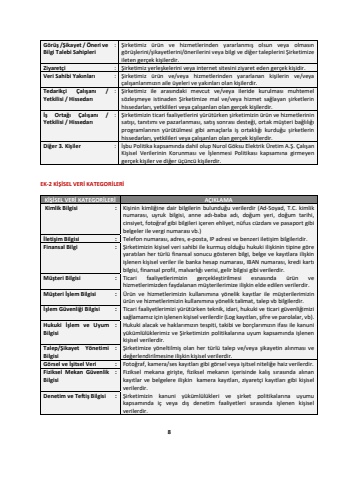 8G%u00f6r%u00fc%u015f /%u015eikayet / %u00d6neri ve Bilgi Talebi Sahipleri:%u015eirketimiz %u00fcr%u00fcn ve hizmetlerinden yararlanm%u0131%u015f olsun veya olmas%u0131n g%u00f6r%u00fc%u015flerini/%u015fikayetlerini/%u00f6nerilerini veya bilgi ve di%u011fer taleplerini %u015eirketimize ileten ger%u00e7ek ki%u015filerdir.Ziyaret%u00e7i:%u015eirketimiz yerle%u015fkeleriniveya internet sitesini ziyaret eden ger%u00e7ek ki%u015fidir.Veri Sahibi Yak%u0131nlar%u0131 :%u015eirketimiz %u00fcr%u00fcn ve/veya hizmetlerinden yararlanan ki%u015filerin ve/veya %u00e7al%u0131%u015fanlar%u0131m%u0131z%u0131n aile %u00fcyeleri ve yak%u0131nlar%u0131 olan ki%u015filerdir.Tedarik%u00e7i %u00c7al%u0131%u015fan%u0131 / Yetkilisi / Hissedar%u0131 :%u015eirketimiz ile aras%u0131ndaki mevcut ve/veya ileride kurulmas%u0131 muhtemel s%u00f6zle%u015fmeye istinaden %u015eirketimize mal ve/veya hizmet sa%u011flayan %u015firketlerin hissedarlar%u0131, yetkilileri veya %u00e7al%u0131%u015fanlar%u0131 olan ger%u00e7ek ki%u015filerdir. %u0130%u015f Orta%u011f%u0131 %u00c7al%u0131%u015fan%u0131 / Yetkilisi / Hissedar%u0131:%u015eirketimizin ticari faaliyetlerini y%u00fcr%u00fct%u00fcrken %u015firketimizin %u00fcr%u00fcn ve hizmetlerinin sat%u0131%u015f%u0131, tan%u0131t%u0131m%u0131 ve pazarlanmas%u0131, sat%u0131%u015f sonras%u0131 deste%u011fi, ortak m%u00fc%u015fteri ba%u011fl%u0131l%u0131%u011f%u0131 programlar%u0131n%u0131n y%u00fcr%u00fct%u00fclmesi gibi ama%u00e7larla i%u015f ortakl%u0131%u011f%u0131 kurdu%u011fu %u015firketlerin hissedarlar%u0131, yetkilileri veya %u00e7al%u0131%u015fanlar%u0131 olan ger%u00e7ek ki%u015filerdir.Di%u011fer 3. Ki%u015filer:%u0130%u015fbu Politika kapsam%u0131nda dahil olup Nurol G%u00f6ksu Elektrik %u00dcretim A.%u015e. %u00c7al%u0131%u015fan Ki%u015fisel Verilerinin Korunmas%u0131 ve %u0130%u015flenmesi Politikas%u0131 kapsam%u0131na girmeyen ger%u00e7ek ki%u015filerve di%u011fer %u00fc%u00e7%u00fcnc%u00fc ki%u015filerdir.EK-2 K%u0130%u015e%u0130SEL VER%u0130 KATEGOR%u0130LER%u0130 K%u0130%u015e%u0130SEL VER%u0130 KATEGOR%u0130LER%u0130A%u00c7IKLAMAKimlik Bilgisi:Ki%u015finin kimli%u011fine dair bilgilerin bulundu%u011fu verilerdir (Ad-Soyad, T.C. kimlik numaras%u0131, uyruk bilgisi, anne ad%u0131baba ad%u0131, do%u011fum yeri, do%u011fum tarihi, cinsiyet, foto%u011fraf gibi bilgileri i%u00e7eren ehliyet, n%u00fcfus c%u00fczdan%u0131 ve pasaport gibi belgeler ile vergi numaras%u0131vb.)%u0130leti%u015fim Bilgisi :Telefon numaras%u0131, adres, eposta, IP adresi ve benzeri ileti%u015fim bilgileridir. Finansal Bilgi :%u015eirketimizin ki%u015fisel veri sahibi ile kurmu%u015f oldu%u011fu hukuki ili%u015fkinin tipine g%u00f6re yarat%u0131lan her t%u00fcrl%u00fc finansal sonucu g%u00f6steren bilgi, belge ve kay%u0131tlara ili%u015fkin i%u015flenen ki%u015fisel veriler ile banka hesap numaras%u0131, IBAN numaras%u0131, kredi kart%u0131 bilgisi, finansal profil, malvarl%u0131%u011f%u0131 verisi, gelir bilgisi gibi verilerdir.M%u00fc%u015fteri Bilgisi:Ticari faaliyetlerimizin ger%u00e7ekle%u015ftirilmesi esnas%u0131nda %u00fcr%u00fcn ve hizmetlerimizdenfaydalanan m%u00fc%u015fterilerimize ili%u015fkin elde edilen verilerdir.M%u00fc%u015fteri %u0130%u015flemBilgisi:%u00dcr%u00fcn ve hizmetlerimizin kullan%u0131m%u0131na y%u00f6nelik kay%u0131tlar ile m%u00fc%u015fterilerimizin%u00fcr%u00fcn ve hizmetlerimizinkullan%u0131m%u0131na y%u00f6nelik talimat, talepvb bilgilerdir. %u0130%u015flem G%u00fcvenli%u011fi Bilgisi:Ticari faaliyetlerimizi y%u00fcr%u00fct%u00fcrken teknik, idari, hukuki ve ticari g%u00fcvenli%u011fimizi sa%u011flamam%u0131z i%u00e7in i%u015flenen ki%u015fisel verilerdir (Log kay%u0131tlar%u0131, %u015fifre ve parolalar, vb).Hukuki %u0130%u015flem ve Uyum Bilgisi:Hukuki alacak ve haklar%u0131m%u0131z%u0131n tespiti, takibi ve bor%u00e7lar%u0131m%u0131z%u0131n ifas%u0131 ile kanuni y%u00fck%u00fcml%u00fcl%u00fcklerimiz ve %u015eirketimizin politikalar%u0131na uyum kapsam%u0131nda i%u015flenen ki%u015fisel verilerdir.Talep/%u015eikayet Y%u00f6netimi Bilgisi:%u015eirketimize y%u00f6neltilmi%u015f olan her t%u00fcrl%u00fc talep ve/veya %u015fikayetin al%u0131nmas%u0131 ve de%u011ferlendirilmesine ili%u015fkin ki%u015fisel verilerdir. G%u00f6rsel ve %u0130%u015fitsel Veri:Foto%u011fraf, kamera/ses kay%u0131tlar%u0131 gibi g%u00f6rsel veya i%u015fitsel niteli%u011fe haiz verilerdir.Fiziksel Mekan G%u00fcvenlik Bilgisi:Fiziksel mekana giri%u015fte, fiziksel mekan%u0131n i%u00e7erisinde kal%u0131%u015f s%u0131ras%u0131nda al%u0131nan kay%u0131tlar ve belgelere ili%u015fkin kamerakay%u0131tlar%u0131, ziyaret%u00e7i kay%u0131tlar%u0131 gibi ki%u015fisel verilerdir. Denetim ve Tefti%u015f Bilgisi :%u015eirketimizin kanuni y%u00fck%u00fcml%u00fcl%u00fckleri ve %u015firket politikalar%u0131na uyumu kapsam%u0131nda i%u00e7 veya d%u0131%u015f denetim faaliyetleri s%u0131ras%u0131nda i%u015flenen ki%u015fisel verilerdir.